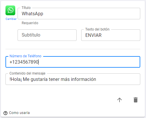 Enlace de de integración de Whatsapp: Usa esta función para permitir que tus clientes te envíen mensajes pre-escritos o para vincular tu contacto de Whatsapp para que tus clientes y usuarios se puedan comunicar contigo.