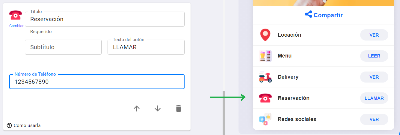 Enlace de Llamada: Usa este enlace para permitir que tus clientes o usuarios se comuniquen contigo o con tu negocio. Agrega el número de teléfono dónde te gustaría recibir estas llamadas.
