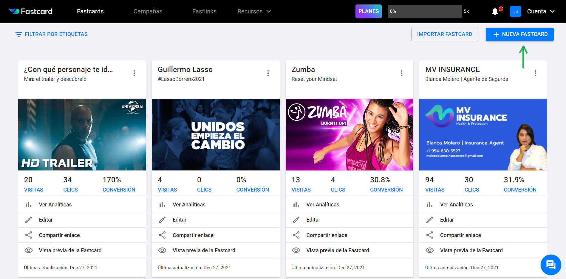 - Haz clic en el botón + Nueva Fastcard, en la parte superior derecha de la página